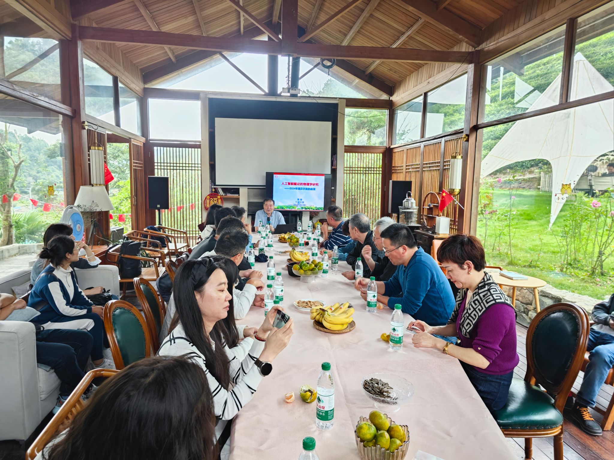 随后一行人前往位于牛丈岙村的爵溪农庄会议室,开展由学院关工委承办的青年教师座谈会,学院党政领导、35周岁以下青年教师参加,会议邀请了学校“五老”成员之一的退休教师党员周骏教授担任主讲嘉宾作“人工智能驱动的物理学研究—2024年诺贝尔奖的启发”的主题讲座,他指出,2024年诺贝尔物理学奖由美国科学家约翰·霍普菲尔德与英国科学家杰弗里·辛顿因“在人工神经网络机器学习方面的基础性发现和发明”获得,表彰他们在使用人工神经网络进行机器学习的基础性发现和发明,不仅是对他们数十年研究成果的认可,更是对整个机器学习领域发展意义的深刻反思。作为现代人工智能的基石,人工神经网络通过模仿人类大脑的信息处理方式,正在改变着各行各业,从自动驾驶到医疗影像分析,再到智能客服和个性化推荐系统,人工神经网络的应用无处不在。周骏教授表示,这项诺贝尔奖旨在表彰受生物学和更广泛的生物物理学领域启发的物理学,在对这些领域的理解以及计算机科学和AI的应用方面带来了一些真正的变革性进步,这表明诺贝尔奖越来越忠实于跨学科的研究。接下来,学院执行院长段香梅和党委书记朱学庆分别为诸跃进教授和周骏教授颁发关工委聘书,二位退休教授一起为在场的青年教师传授经验、答疑解惑、沟通交流,现场气氛热烈。最后,诸跃进教授预告了10月23日由学院关工委和研究生会共同承办“我与导师面对面”活动,鼓励青年教师积极参与。