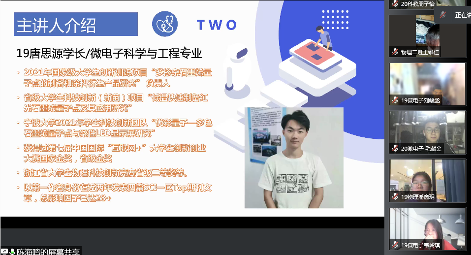 习近平总书记提出 “广大青年要肩负历史使命,坚定前进信心,立大志、明大德、成大才、担大任,努力成为堪当民族复兴重任的时代新人,让青春在为祖国、为民族、为人民、为人类的不懈奋斗中绽放绚丽之花”。为营造全院浓厚的科研创新文化氛围,激发青年科研创新灵感与热情,服务于青年科技创新工作,引领广大青年学子崇尚科学、追求真知,助力学校双一流建设。91国产 2022年“启智未来”大学生科研创新文化活动暨大学生科研育苗分享会物理学院专场于2022年5月15日晚在线上成功举办。
