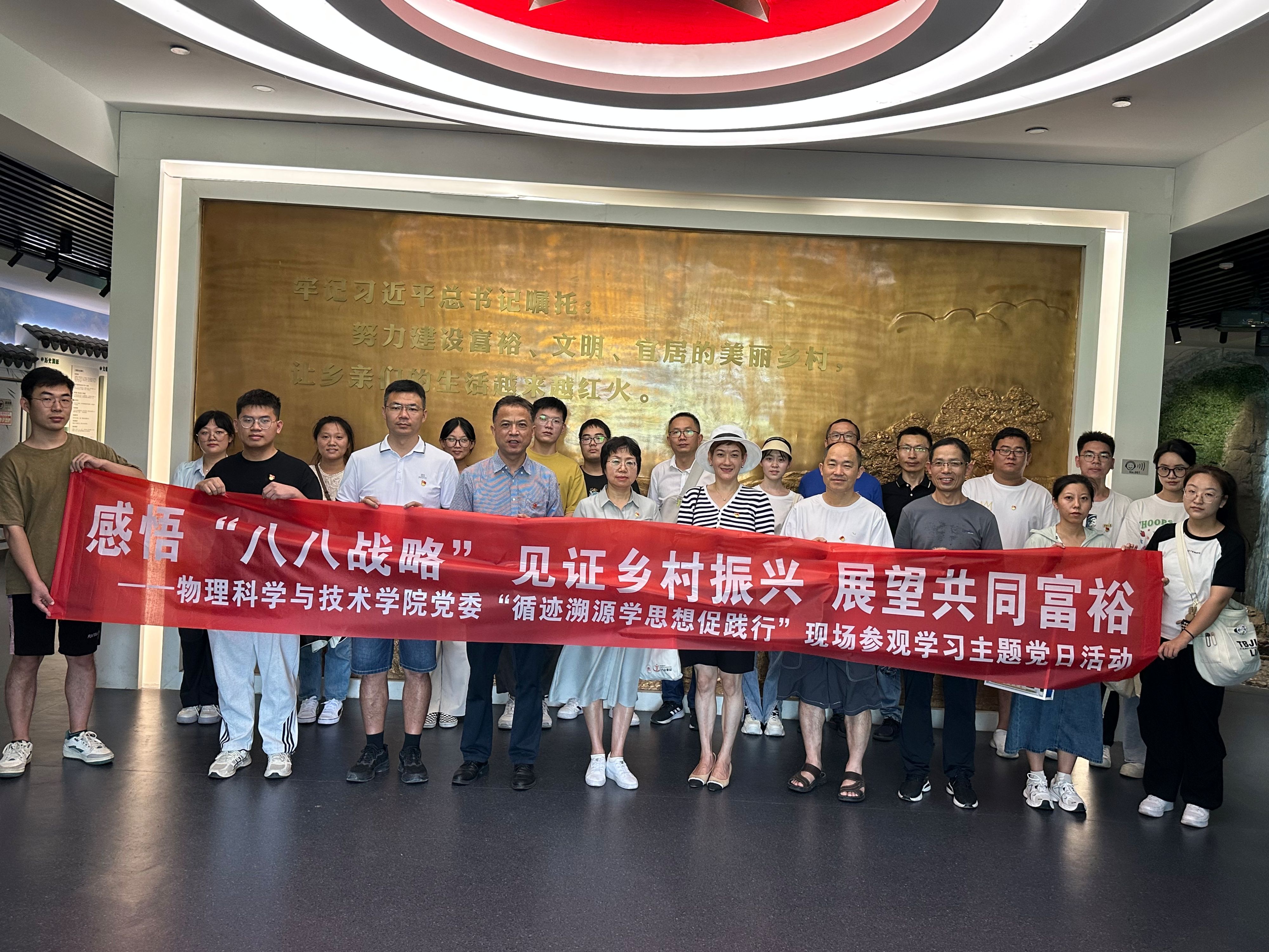 为进一步深入学习贯彻习近平新时代中国特色社会主义思想,引导师生党员重走习近平浙江足迹,在循访中体悟“八八战略”实施20年来的浙江实践,感受习近平新时代中国特色社会主义思想的真理伟力,凝聚奋进中国式现代化赶考路的磅礴力量,8月8日,91国产 党委赴余姚市梁弄镇横坎头村开展“循迹溯源学思想促践行”学习活动暨“感悟‘八八战略’,见证乡村振兴,展望共同富裕”主题党日活动,走进新时代文明实践站、余姚市红廉馆、浙东抗日根据地旧址群、“浙东红村”风貌区等地,实地体验“红色引领、绿色发展”的乡村振兴之路,物理系教师党支部、行政教工党支部、研究生第一党支部的师生党员参加。