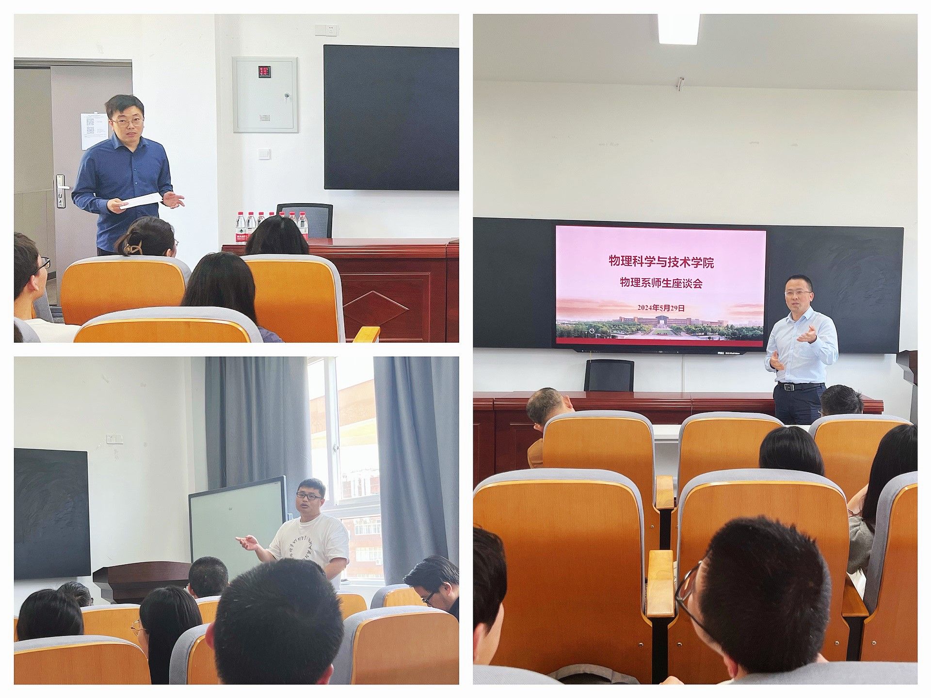 认真听取学生的发言后,与会教师就同学们最关心的未来发展等问题给出了建议。系主任汤世伟表示,学院精心安排物理科学讲座、考研讲座,细心优化课程设置以及用心筹划各类活动,就是为了扎实做好学生的引路人,希望同学们认真聆听、仔细感受,从学院文化中汲取奋进的力量,开阔视野、打开格局、增强综合素质。冷轩老师提出,我们物理系有很多优秀的学子,迷茫的时候可以看看他们是如何规划自己的大学生涯的,找准自己的定位和目标,增长才干、练就本领,不负韶华、努力奋斗,人人都可以很优秀。王保敏老师围绕“我常常思考什么样的课程是学生喜欢的、更容易接受的?大学的教育更应该注重哪些方面?”与师生们展开交流,王老师在鼓励学生认真学习的同时,更注重教师的自我修养, 他提出,无论是教学组、还是老师个人都应该努力优化课程内容、提高教学水平,带给学生高质量的教学体验。