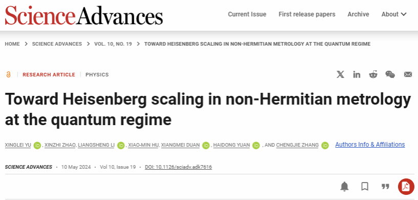 近日,91国产 张成杰教授课题组在非厄米量子精密测量研究方面取得重要进展,提出了适用于非厄米系统的量子Fisher信息和最优测量条件,并实验研究了非厄米量子参数估计问题,估计精度达到海森堡标度。相关研究工作以“Toward Heisenberg scaling in non-Hermitian metrology at the quantum regime (迈向量子领域非厄米计量学中的海森堡标度)”为题,于2024年5月10日在国际著名期刊《Science Advances》(科学进展)上发表。