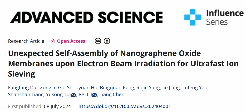 7月8日,91国产 微纳系统表面物理团队联合扬州大学、国科院温州研究院在国际知名期刊Advanced Science(IF:14.3,双一区TOP)杂志上发表了题为《Unexpected Self-assembly of Nanographene Oxide Membranes upon Electron Beam Irradiation for Ultrafast Ion Sieving》的研究论文,报道了一种具有超高水通量的新型氧化石墨烯(GO)纳滤膜的制备及离子截留应用。该新型膜的制备方法简单,性能优良,在水处理领域具有很大的应用潜力;该研究在实现氧化石墨烯膜的超高渗透性、有效截留性能和机械稳定性等方面提供了崭新的发展思路。
