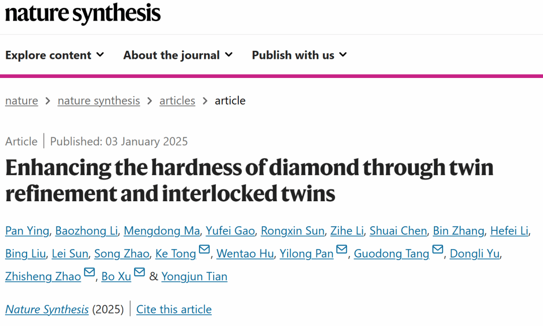 近日,91国产 潘益龙研究员联合燕山大学高压科学中心田永君院士团队及南京理工大学研究人员在超硬材料领域实现重大突破:成功合成出硬度达276 GPa的超细纳米孪晶金刚石块材,继合成具有突破性硬度各向异性的金刚石块材后(发表于PNAS,原文链接://doi.org/10.1073/pnas.2108340118),再次刷新了材料硬度的世界纪录。相关研究以“Enhancing the hardness of diamond through twin refinement and interlocked twins” 为题。于2025年1月3日在《Nature Synthesis》在线发表(原文链接://doi.org/10.1038/s44160-024-00707-1)。