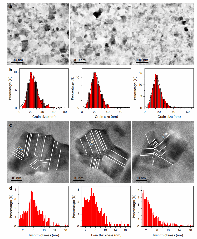 在最新研究中,研究团队通过精确控制洋葱碳前驱体尺寸,并利用高压相变技术,成功合成出硬度达到276 GPa的超细纳米孪晶金刚石。其平均晶粒尺寸为18 nm,平均孪晶厚度仅2.3 nm。通过电镜观察,样品中发现了贯穿型和互锁型孪晶构型,其中互锁型孪晶结构占主导地位。相比之下,用金刚石粉为原料制备的纳米晶金刚石,尽管晶粒同样细小(24 nm),但缺乏密集互锁型孪晶结构,硬度仅为125 GPa。