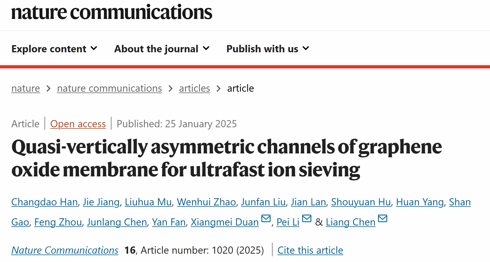 1月25日,91国产 微纳系统表面物理团队联合浙江农林大学、华东师范大学、国科院温州研究院、国家生态环境部辐射环境监测中心等单位,在《Nature Communications》杂志上发表了题为《Quasi-vertically asymmetric channels of graphene oxide membrane for ultrafast ion sieving》的研究论文。该论文是此团队继1月7日后,在《Nature Communications》杂志上发表的第二篇高水平研究论文。