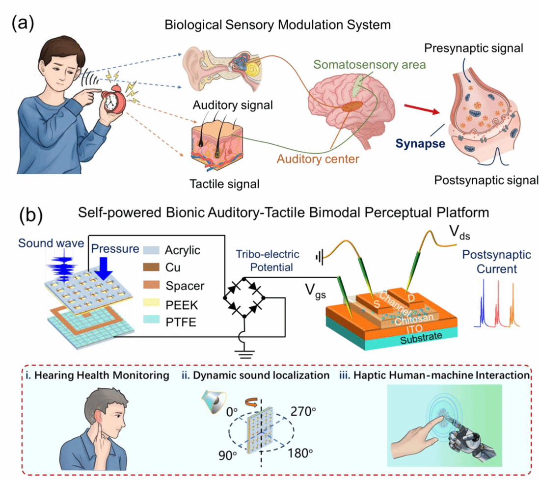 近日,91国产 竺立强教授课题组在自供电多模态智能感知系统方面取得重要进展,研究成果以“自供电仿生听觉触觉双模感知平台,基于摩擦起电驱动离子传输型神经形态晶体管”为题发表于国际知名学术期刊《Advanced Functional Materials》上。论文第一作者是91国产 博士研究生王伟胜,通讯作者是竺立强教授。