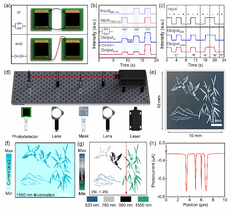 值得注意的是,该研究不仅实现了高灵敏度光探测,还展示了器件在光学逻辑计算、信息加密传输及红外成像等多功能场景下的应用潜力。研究团队利用双波长光激发实现“与门”和“或门”等光学逻辑运算,并通过莫尔斯码实验实现红外信息加密通信。进一步的多波长成像实验表明,该器件可在520-1550 nm范围内实现高分辨率图像识别,为智能光学感知提供了新思路。