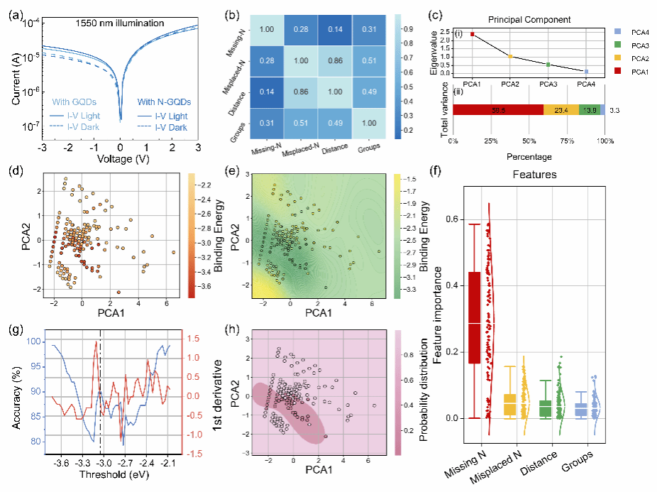 碳基光电探测器凭借低成本、柔性可加工和宽光谱响应特性,在红外成像、光通信与信息安全等领域具有广阔应用前景。然而,传统碳基材料在近红外尤其是通信波段(1550 nm)的探测性能受限,主要瓶颈在于光吸收不足与载流子复合严重。为突破这一限制,研究团队引入机器学习与实验结合的策略,从氮掺杂石墨烯量子点的缺陷结构出发,发现“缺失氮”是影响界面耦合和载流子传输的关键因素。