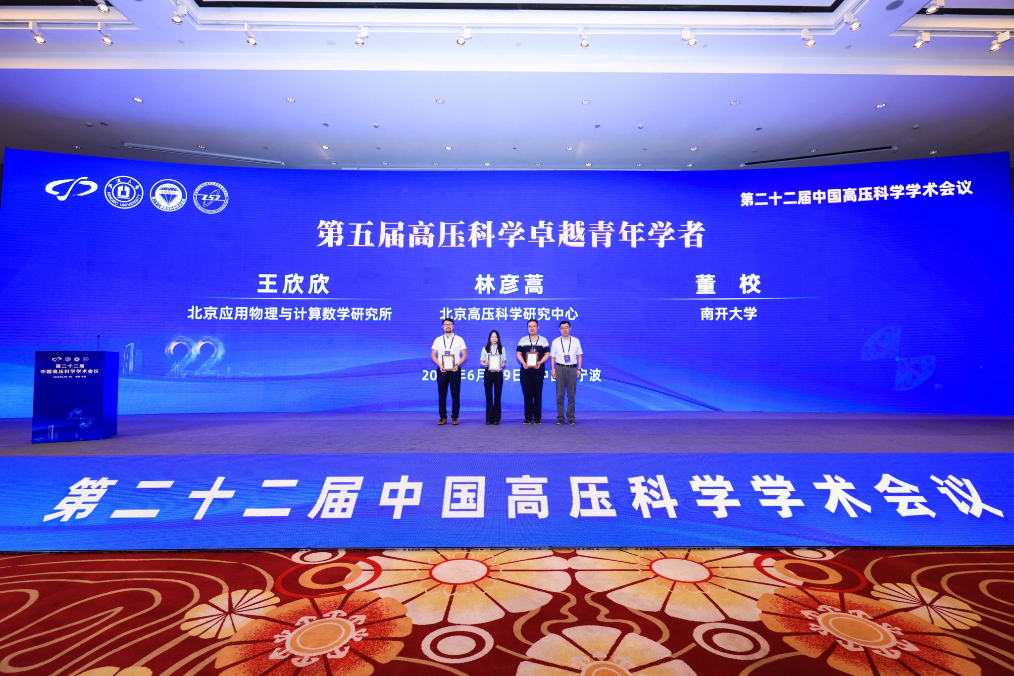 北京高压科学研究中心毛河光院士、中国工程物理研究院流体物理研究所吴强院士、浙江大学马琰铭院士为开幕式分别致辞。开幕式还举办了第五届高压科学卓越青年学者颁奖仪式,由田永君院士为北京应用物理与计算数学研究所王欣欣、北京高压科学研究中心林彦蒿、南开大学董校三位青年学者颁奖。