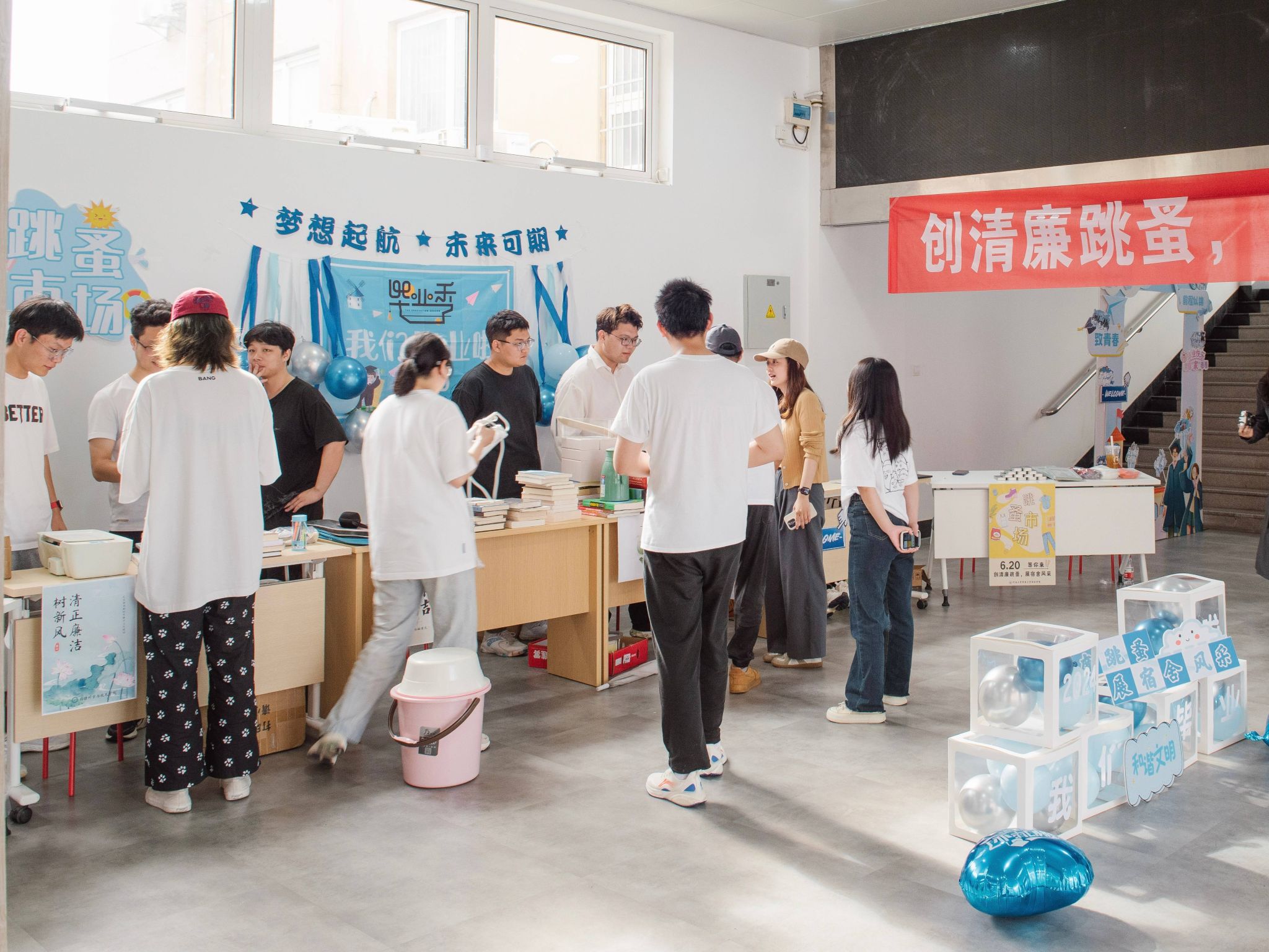 为了进一步彰显学院特色,学院还特别展出了“小理鱼”吉祥物抱枕,作为学院特有的文创产品,吸引了不少同学的注意。工作人员还对每个摊位进行了简单布置,张贴上学院师生设计制作的清廉文化海报,旨在让毕业生们在出售与购买的过程中切实提升廉洁自律意识。