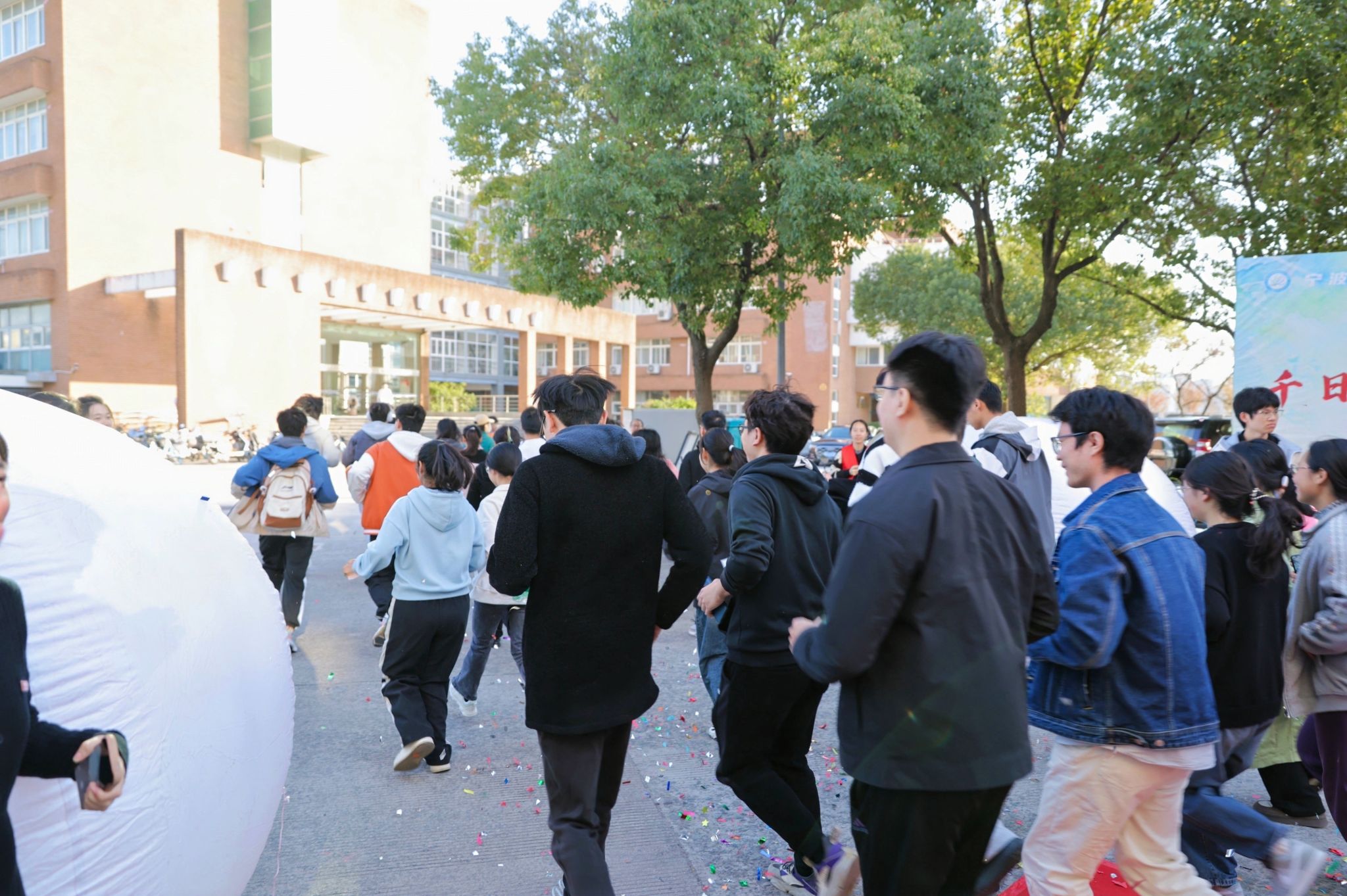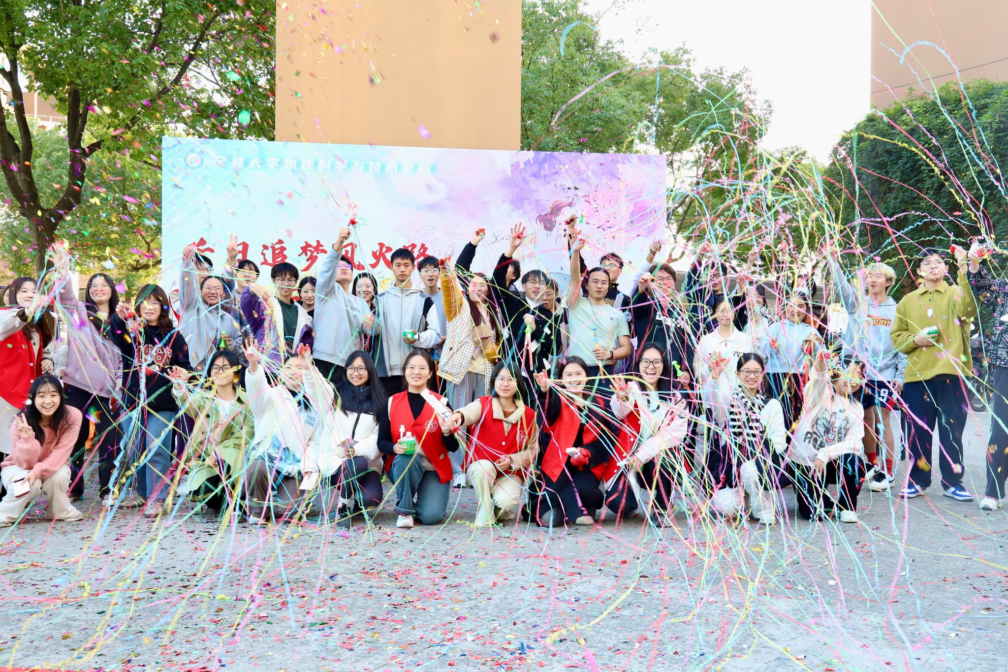 当日下午,来自十余个学院的师生和返校的物院校友们共计200余人齐聚于龙赛理科楼前,蓄势待发;工作人员们有条不紊,一切准备就绪,大家都以饱满的热情迎接即将到来的活动。在彩带飞舞和在礼炮齐鸣中,校长蔡荣根院士宣布彩虹跑开跑。随着蔡校长的一声令下,参与者们一齐冲出起跑线、奔向各个活动打卡点。