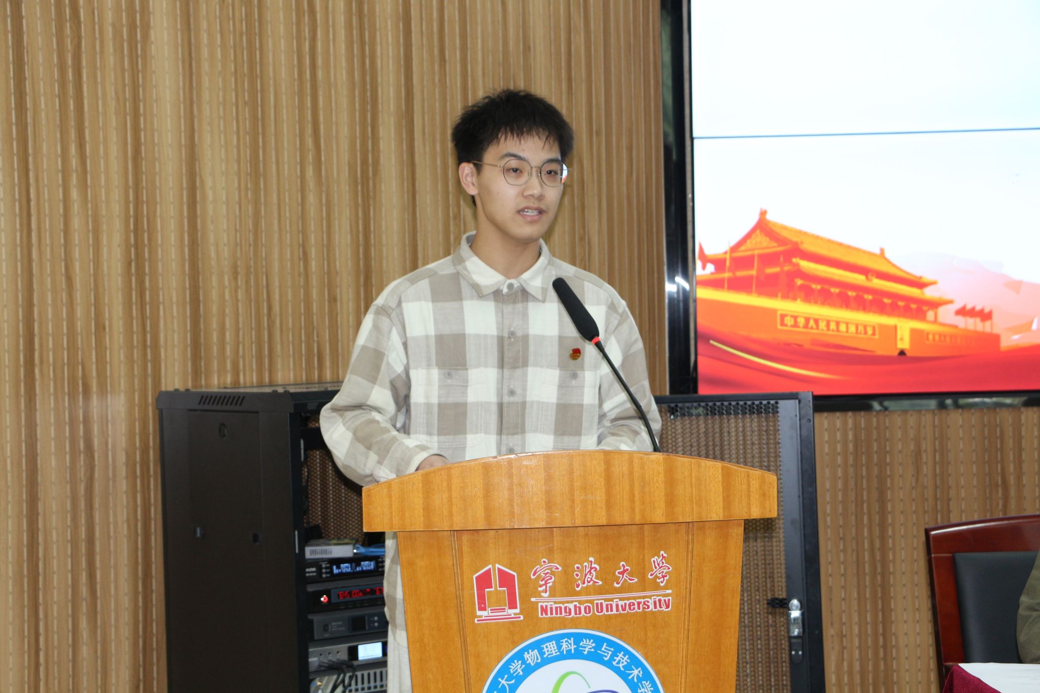 朱学庆书记和与会老师为羊言、路集善、张新云等10名优秀学员颁发荣誉证书。本科生第一党支部羊言作为积极分子培训班班长发言,他表示将继续向优秀的共产党员看齐,坚守初心使命,真正成为有理想、有方向、敢创新、能实干的物理人。本科生第二党支部路集善作为优秀学员代表分享学习感悟,他表示将在“科学家精神”的引领下勇攀科学高峰、秉持科学精神、塑造清廉品格、拓宽知识视野、服务社会青春,全力以赴共筑中国梦。优秀发展对象、“启明星”科普宣讲团成员张新云做《拓荒爆炸力学,科研为国为民》微党课展演,以生动的讲演形式阐述了郑哲敏先生在力学的道路上的人生轨迹,号召学员们以自强不息的精神攀登、书写奋斗青春。