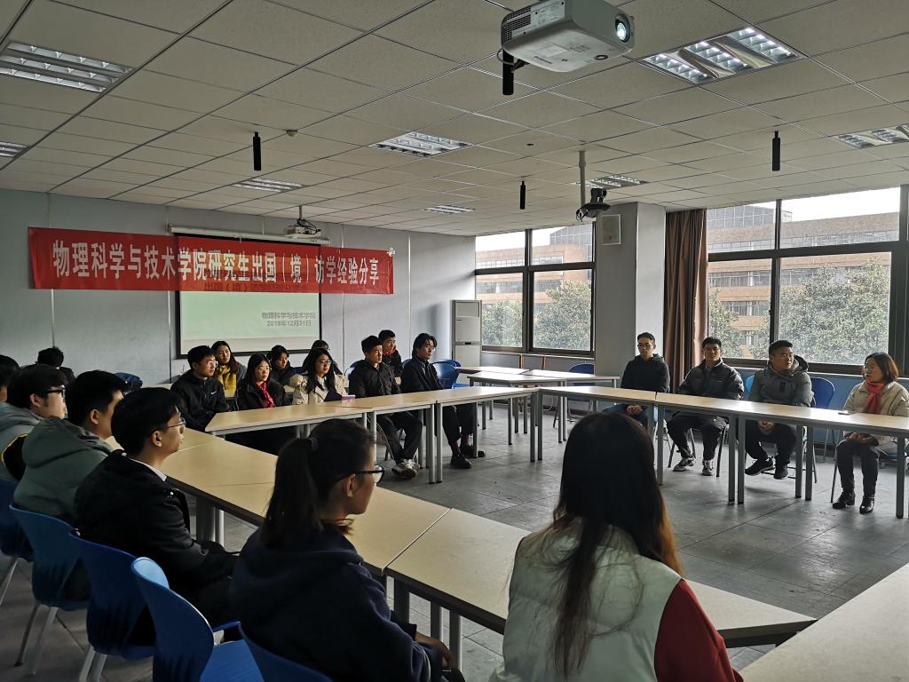 物理学院举办研究生出国(境)访学经验分享会张淼为推动高水平人才培养,拓宽学生升学渠道,12月31日下午,物理学院在1号教学楼301智慧教室举行研究生出国(境)访学经验分享会。出席本次分享会的有学院副院长段香梅、研究生辅导员及研究生50余人。段院长就研究生海外访学项目的申报条件、访学时间、行程安排、访学内容、访学费用、资助政策及注意事项进行了详细的讲解,并就学生提问进行了答疑。在经验分享中,7位参与访学的研...